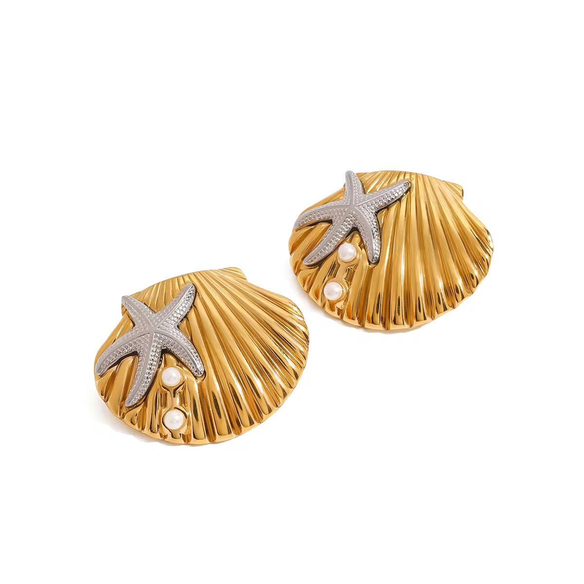 The Ocean Shell Statement Earrings are bold and golden, featuring a textured seashell base, silver starfish, and delicate pearl accents. They’re the ultimate summer statement, perfect for beach days, sunset dinners, or whenever you want to bring ocean magic to your style.